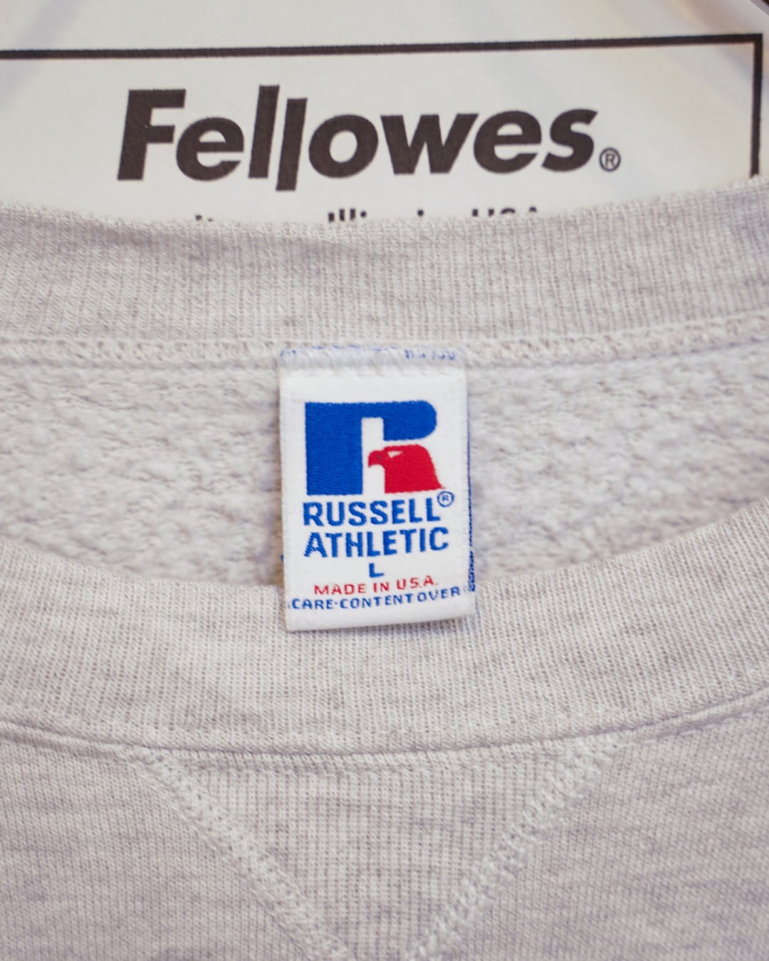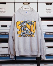 サウスダコタ州立大学(SDSU)のマスコット「ジャックラビット」が描かれたアスレチックスウェット。「JACKS」は大学のスポーツチーム全体を指す愛称で、アメフト・バスケ・陸上など複数競技を横断して使用されています。ボディはUSA製のラッセル。ユニークなロゴ構成とマスコットのキャラクター性が光る一枚です。
